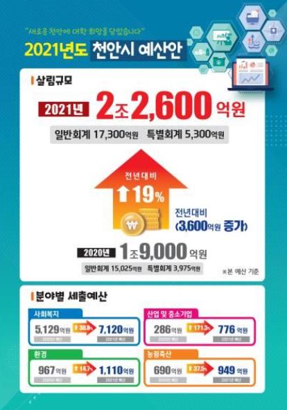 천안시는 코로나19로 침체된 지역경기 회복과 더 큰 도약을 위한 총 2조2,600억 원의 규모의 2021년도 본예산을 편성해 20일 천안시의회에 제출했다고 밝혔다.