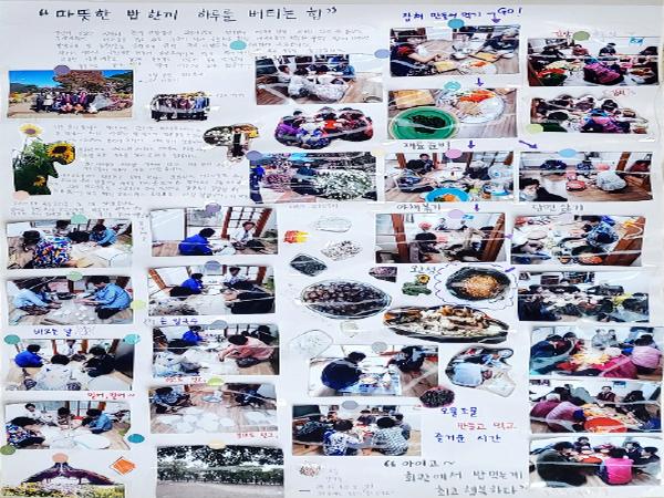 전지 2장에 빼곡하게 70여장의 사진과 글이 담겨있는 포스터에는 “따뜻한 밥 한끼 하루를 버티는 힘”, “회관에서 밥 먹는게 최고 행복하다”등의 급식도우미 지원사업에 대한 어르신들의 마음이 고스란히 전달되어 있다.