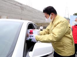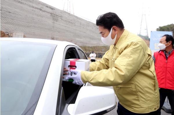 백군기 용인시장은 20일 처인구 삼가동 용인미르스타디움서 열린 드라이브 스루 직거래 장터에서 김장김치 판매를 지원하며 구입에 나선 시민들에게 감사인사를 했다.