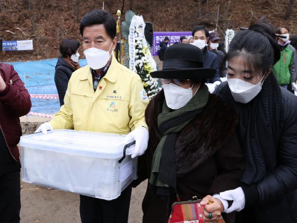 대전 동구는 20일 낭월동에서 곤룡골 한국전쟁 민간인 희생자 유해 봉안식을 열고 올해 발굴한 희생자 유해 250구를 세종시 추모의 집에 안치했다.