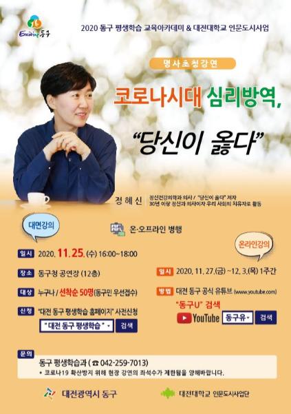 대전 동구는 이달 25일 코로나19의 장기화로 지친 주민을 위한 명사특강을 개최한다.