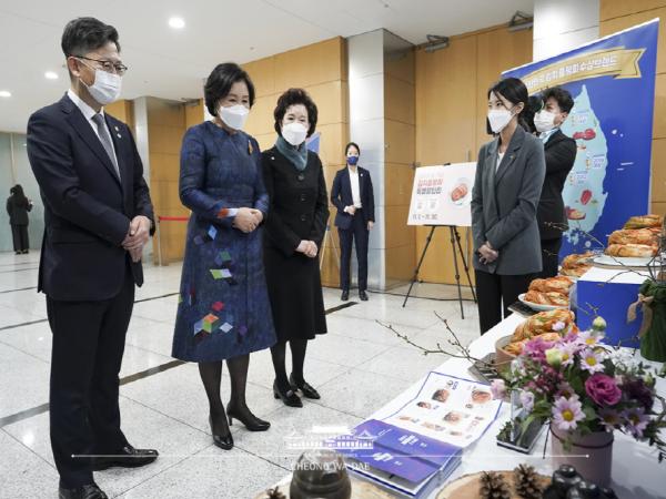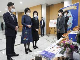김정숙 여사는 기념식 전 행사장 앞에 전시된 ‘제9회 김치품평회’ 수상작 7점을 살펴보며, 각 수상작에 대한 의미를 듣고, 관계자들을 격려하였다.