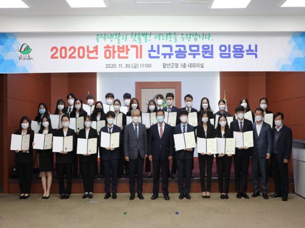 함안군은 20일 오후 5시, 군청 3층 대회의실에서 조근제 군수를 비롯한 간부공무원, 신규임용공무원 등 30여명이 참석한 가운데 ‘2020년 신규공무원 임용식’을 개최했다.