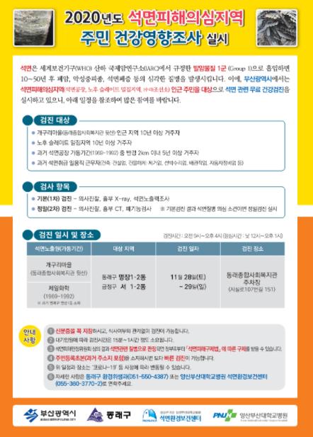 이에 잠복기가 최소 10년부터 최대 50년까지인 석면 노출 피해자를 신속히 발굴하기 위해 부산시는 석면환경보건센터를 통해 2009년부터 매년 석면 노출 지역주민 건강영향조사를 진행하고 있다. 지금까지 1만9,805명이 검진을 받았으며 그 중 석면 질환자는 411명으로 시는 이들의 치료와 생활을 지원한다.