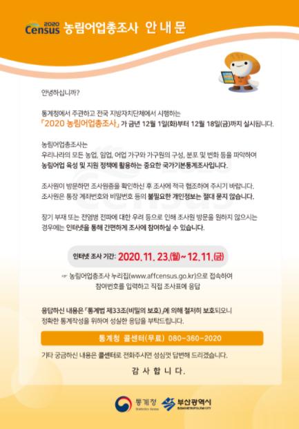 변성완 부산시장 권한대행은 “농림어업총조사는 국제기구 자료교환, FTA, 기후변화, 스마트팜 등 농림어업 환경변화를 파악하기 위한 국가기본 통계조사”라며, “농림어업총조사가 인구주택총조사에 연이어 진행되는 대규모 조사이기 때문에 불편도 우려되지만, 농림어업의 더 나은 미래를 위해 적극적인 참여와 협조를 부탁드린다”고 전했다.