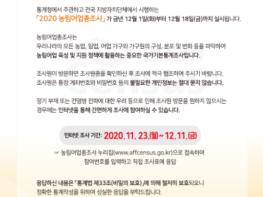 코로나19 확산에 대한 우려와 개인적인 사항을 대면으로 응답하는 것이 부담되는 가구는 11월 23일부터 12월 11일까지 인터넷조사로 참여할 수 있다. 농림어업총조사 누리집(www.affcensus.go.kr)으로 접속해 사전에 우편으로 안내된 참여번호를 입력하고 직접 조사에 응하면 된다. 통계청은 인터넷으로 응답을 완료한 가구 중 전국 5,000가구 내외를 추첨해 1만 원 상당의 ‘농촌사랑 모바일 상품권(농협상품권)’도 제공한다.