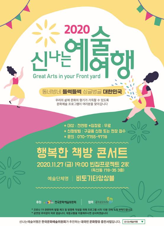 금천문화재단(대표이사 이용진)이 11월 23일(월)부터 12월 11일(금)까지 독산동 빈집프로젝트 1~2家에서 2020년 마지막 ‘문화가 있는 날’과 연계한 특별공연과 전시 프로그램을 운영한다.