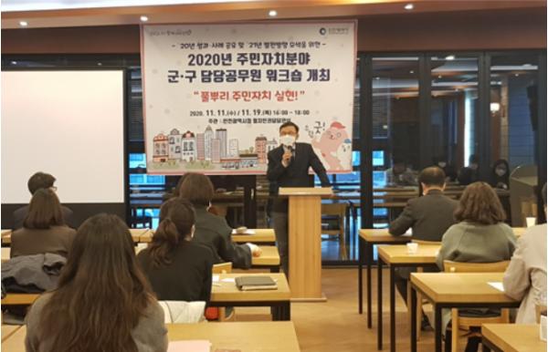 이번 워크숍은 시와 군?구의 주민자치 분야(주민자치회 시범운영, 주민자치센터 운영 및 동협치형 주민참여예산) 관계공무원 40여명이 한자리에 모여, 주민자치에 대한 전문가의 기본이론 강의를 시작으로 2020년 한해 동안 추진해 온 사업추진 사례를 공유하고 2021년 주요사업의 추진방향에 대해 함께 논의하는 순으로 진행되었다.