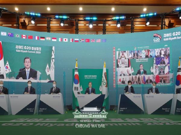문재인 대통령은 21일, 화상으로 개최된 G20 정상회의에 참석했다. 당초 올해 G20 의장국인 사우디아라비아에서 개최될 예정이었지만 코로나19 상황에 따라 화상으로 22일까지 이틀에 걸쳐 진행된다.
