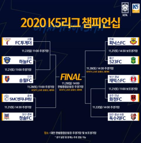 2020 K5리그 챔피언십이 11월 21일부터 29일까지 대전광역시 한밭종합운동장(주경기장 및 보조경기장)에서 열린다. 올해로 2회째를 맞이한 이번 챔피언십은 조별리그에 이은 4강 토너먼트로 진행된 지난해와 달리 10강 토너먼트로 시작된다. 10강 및 6강 토너먼트는 21일과 22일에 열리고, 준결승전은 28일, 대망의 결승전은 29일에 열린다.