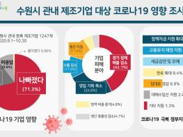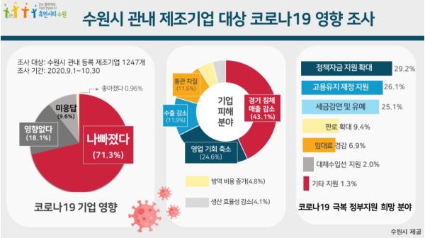 수원시가 지난 9월 1일부터 10월 31일까지 관내 등록 제조기업 1247개사(2020년 7월 31일 기준)를 대상으로 ‘코로나19 발생·장기화에 따른 영향’을 조사한 결과, 전체 기업의 71.3%가 “경영상황이 나빠졌다”고 답했다. ‘별 영향 없다’는 18.1%였고, ‘좋아졌다’는 기업은 0.96%에 불과했다(미응답 9.6%).