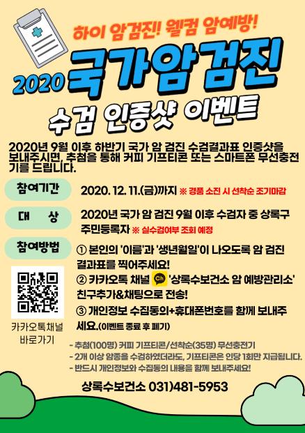 이날부터 시작되는 이벤트는 ‘상록수보건소 암 예방관리소’ 카카오톡 채널을 통해 국가 암검진 결과표를 채팅으로 보내면 수검여부를 확인해 135명을 선정해 스마트폰 무선충전거치대 또는 커피 기프티콘을 제공한다.