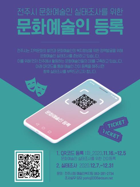 전주시 문화정책과 관계자는 “예술인 복지를 향상시키고 시민들의 문화향유 기회를 확대해 나가기 위해 전주 지역의 많은 문화예술인들이 이번 사전등록과 설문조사에 반드시 참여해달라”고 당부했다.