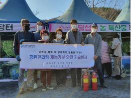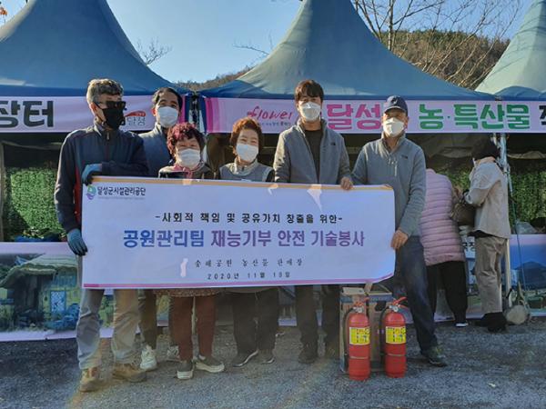 이번 재능기부 기술봉사는 달성군시설관리공단 공원관리팀에서 근무하고 있는 전기, 기계(소방), 조경, 토목 관련 직원들이 각자 전문분야의 기술을 발휘해 지역 농산물 판매장의 안전점검을 통해 소화기 비치, 천막 구조물 점검, 전기시설 점검 등을 진행했다.