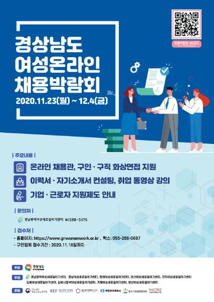 경상남도가 코로나19 여파로 구인·구직활동이 어려워진 기업체와 여성구직자를 지원하기 위해 11월23일부터 12월4일 '비대면 여성일자리 잡(Job)기(氣)' 행사를 개최한다.
