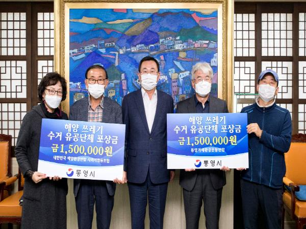 통영시는 11월 20일 통영시청 시장실에서 2020년 해양수산부 주관 해양쓰레기 역량평가에서 통영시가 전국 73개 연안 기초 지자체 중에서 최우수 지자체로 선정된 것에 공로가 많았던 통영거제환경운동연합과 대한민국해양환경연합 사회적 협동조합 2개 환경단체에 대해 포상금 전달식을 가졌다.
