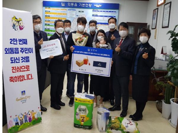 환영행사에서는 경기도 의왕시에서 전입한 박두환 씨 부부에게 2만 번째 전입 주민인증서와 경주 힐튼호텔에서 제공한 숙박권과 외동읍 농산물(꿀, 명품쌀 등) 등을 전달했다.