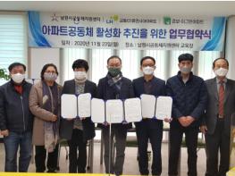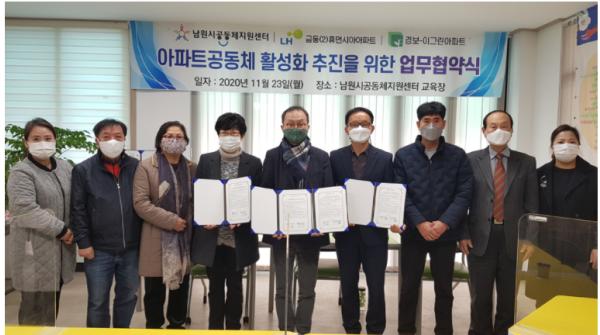 남원시 공동체지원센터는 지난 23일 센터 교육장에서 남원 금동(2) 휴먼시아, 남원 경보-이그린 아파트와 공동체 활성화에 관한 업무협약(MOU)을 체결했다고 밝혔다.