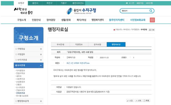 용인시 수지구는 24일 공동주택관리법 위반행위를 계도하기 위해 관리주체 및 입주자대표회의가 아파트 관리업무 중 법을 위반한 사항들을 홈페이지에 공개했다.