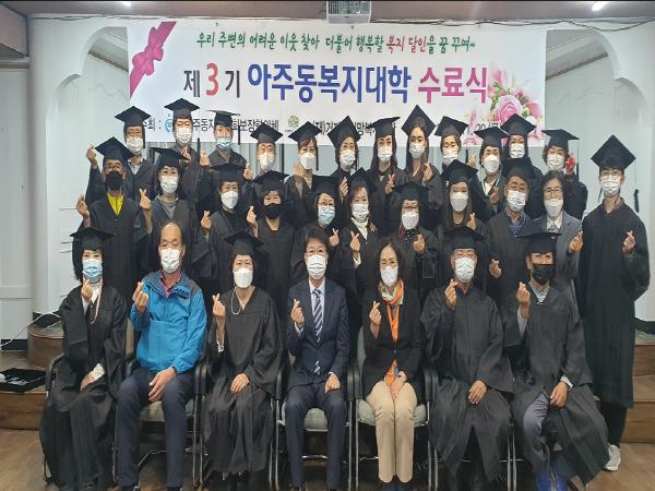 이날 수료식에 참석한 서권완 아주동장은 “코로나19로 미뤄졌던 복지대학이 수료식까지 잘 마무리되어 기쁘게 생각한다”며 “이번 교육을 통해 키워진 역량을 지역사회에 충분히 발휘하여 복지리더로서 중추적인 역할을 해주실 것으로 기대한다”고 격려했다.