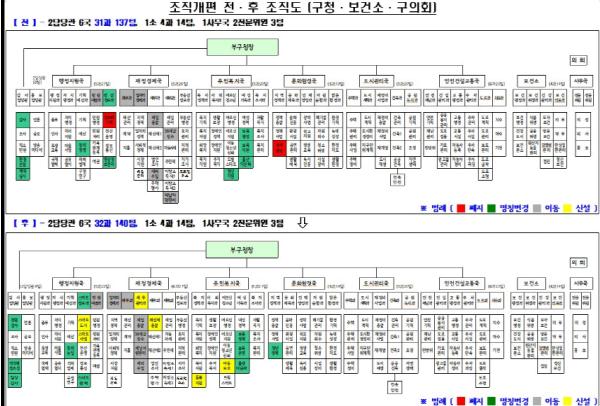 이 외도 (감사담당관) 감사팀이 ‘청렴감사팀’으로, 환경순찰팀이 ‘적극행정조성팀’으로, 계약심사팀이 ‘일상감사팀’으로, (기획예산과) 창의경영팀이 ‘창의뉴딜팀’으로, (여성가족과) 보육행정팀이 ‘보육정책팀’으로, 보육지원팀이 ‘보육운영팀’으로, 출산다문화팀이 ‘출생다문화팀’으로 각각 이름을 바꾼다.