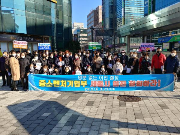 이날 통장들은 국민청원 참여 안내용 전단을 나눠주면서 중소기업벤처기업부의 세종 이전 철회를 위해 시민이 구체적 행동으로 이어질 수 있도록 홍보했다.