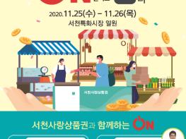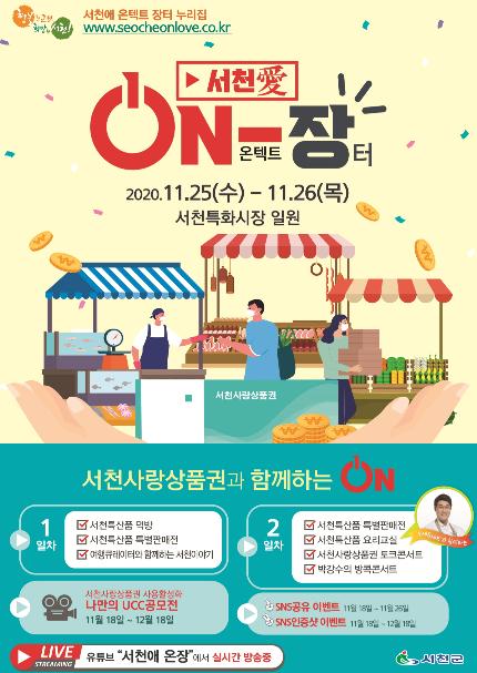 서천군이 코로나19로 침체한 소비 진작과 서천사랑상품권의 활성화를 위해 25일부터 26일까지 ‘시장애(愛) 온(On)-장’ 행사를 비대면으로 개최한다.