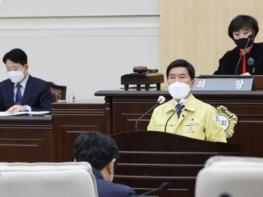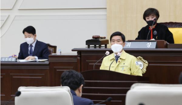 대전광역시 동구 황인호 구청장이 24일 동구의회 본회의장에서 열린 제254회 동구의회 정례회 개회식에서 2021년도 본예산 제출에 따른 시정연설로 내년도 구정운영 방향을 제시하고 본예산 의결에 대한 동구의회의 협조를 구했다.