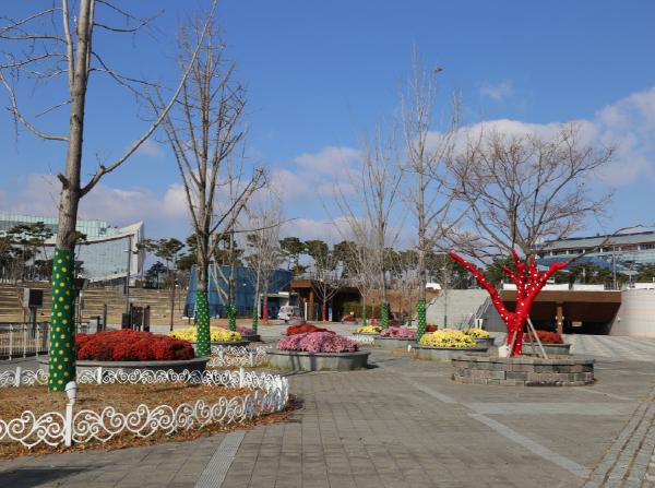 세종호수공원 중앙광장에 식재된 조경수가 형형색색의 옷을 입고 겨울을 맞이한다.