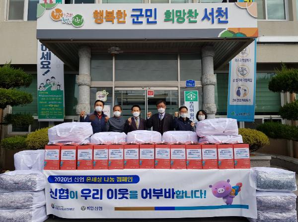 서천군 비인신협(이사장 유배근)이 24일 ‘온(溫)세상 나눔 캠페인’의 일환으로 지역 내 어려운 이웃에 전해달라며 비인면에 이불 20채와 생필품으로 구성된 ‘어부바 박스’ 20개(200만 원 상당)를 기탁하고, 비인면 김장 나눔 행사의 재료비 명목으로 100만 원을 후원했다.