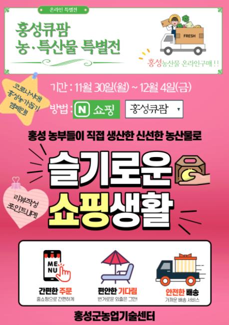 홍성군농업기술센터는 코로나19로 위축된 지역 농˙특산물의 판로개척을 위해 오는 11월 30일부터 12월 4일까지 5일간 강소농 ‘홍성큐팜’농·특산물 온라인 판매행사를 개최한다.