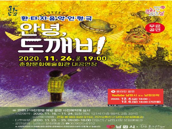 한편, 『안녕 도깨비』 공연은 공연장 입장객이 제한된 상황에 더 많은 시민들에게 폭넓은 문화예술 서비스를 제공하기 위하여 온라인 공연도 함께 진행한다. 온라인 공연은 12.4.(18시)~12.6,(18시) 기간 한정 남원시?남원와락 유튜브를 통해 감상할 수 있다.