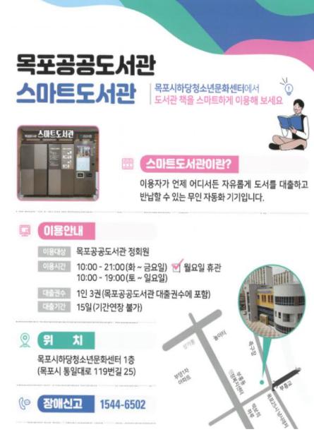 ‘스마트도서관’은 도서관 이용이 어려운 지역민을 위해 시간 제약 없이 운영되는 무인형 도서대출시스템으로 목포공공도서관의 지원으로 하당청소년문화센터에 설치되어 운영된다.
