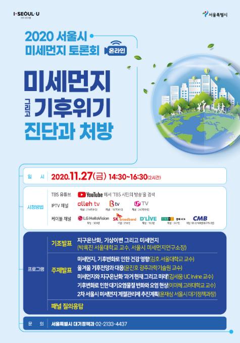 지난해 5월 출범한 ‘서울시 미세먼지 연구소(소장 박록진 서울대학교 교수)’가 주관하는 이번 토론회는 대기 및 기상분야의 과학적 측정·분석 전문가 및 학계 인사 등을 초청해 미세먼지 그리고 기후위기 시대에 대한 과학적 정보를 시민과 공유할 계획이다.