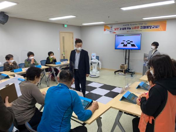 이날 수업은 참여인원을 소규모로 제한하고, 책상에 투명 가림막을 설치하는 등 코로나19 방역수칙을 철저히 준수하여 진행됐으며, 참여 어르신들은 수업 보조교사인 인지훈련 로봇이 보여주는 동작을 따라하는 등 치매예방 교육을 받았다.