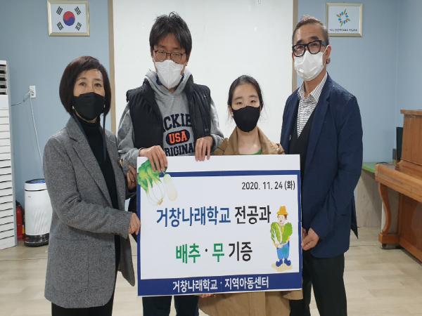 거창나래학교(교장 함영희)는 지난 11월 24일 오전 11시, 배추 30포기와 무 30개를 거창군 느티나무지역아동센터에 후원했다. 지난 9월 파종을 시작으로 전공과(고등학교 졸업 이후 과정) 학생들이 4개월여에 걸쳐 잡초제거와 배추벌레 잡기 등 많은 정성을 들여 가꾼 것이다.