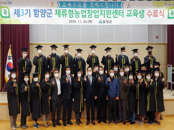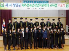 함양군은 24일 오후 1시30분 농업기술센터에서 서춘수 함양군수, 황태진 군의회의장을 비롯해 수료생 및 가족 등 50여명이 참석한 가운데 ‘제3기 체류형농업창업지원센터 수료식’행사를 개최했다.