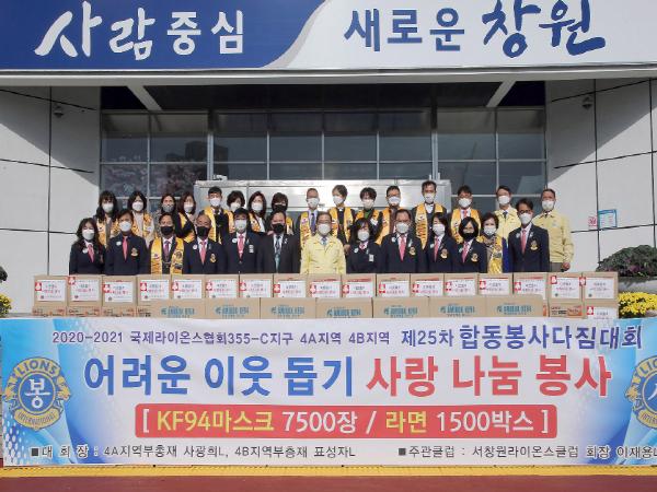 이번 기탁은 국제라이온스협회 355-C지구 4A지역과 4B지역이 당초 11월 25일 KBS창원홀에서 제25차 합동봉사다짐대회를 개최하려 했으나, 코로나 확산 방지를 위한 사회적거리두기 실천에 적극 동참하기 위해 지역사회를 위한 나눔 봉사활동으로 행사를 변경해 마련됐다.