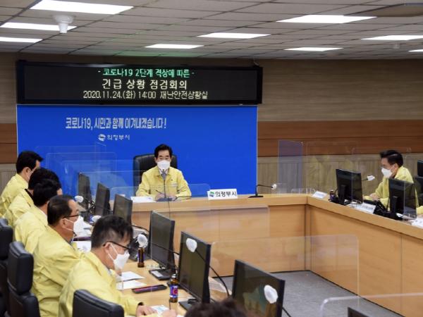 의정부시는 11월 24일 오후 2시 재난안전상황실에서 부서별 국장, 권역국장, 과장 등 간부공무원이 참석한 가운데 코로나19 사회적 거리두기 2단계 격상에 따른 긴급상황 점검회의를 개최했다.