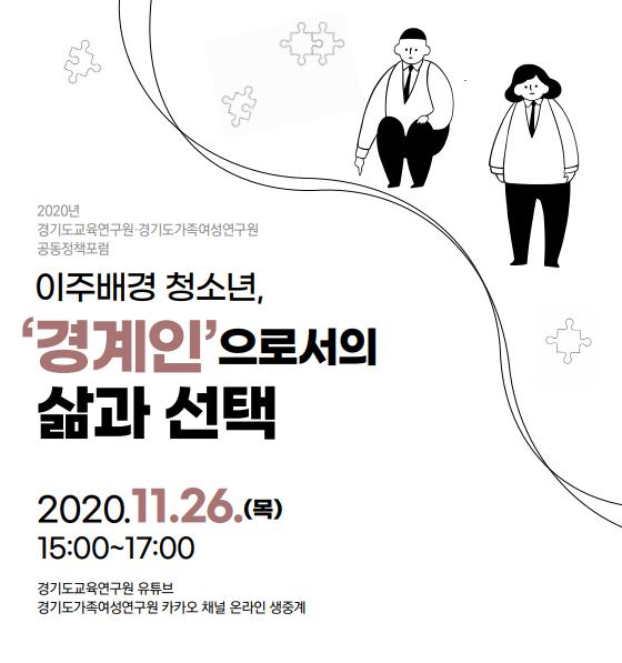 경기도가족여성연구원과 경기도교육연구원이 26일 오후 3시 이주배경 청소년들의 생활을 살펴보고, 이들에 대한 정착지원 방안을 모색해 보는 ‘이주배경 청소년, ‘경계인’으로서의 삶과 선택’을 주제로 한 정책포럼을 공동 개최한다.