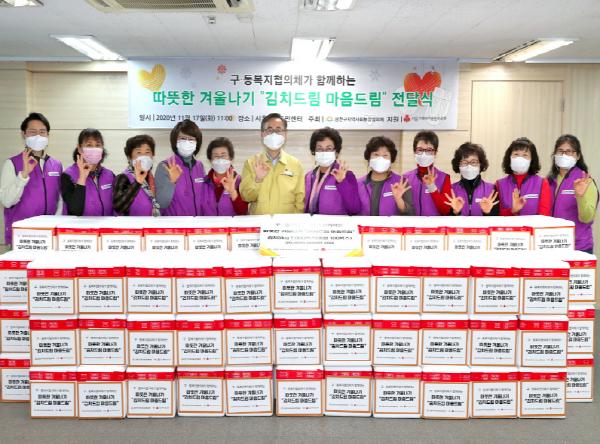 먼저 구·동복지협의체에서 지난 16일(월) 가산동을 시작으로 19일(목)까지 10개동에 김치 5kg 총1,000박스(동별 100박스씩)를 전달했다.