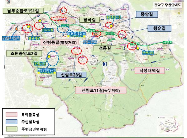 현재 전문 업체를 선정하여 신림로11길, 행운길에 대하여 본격적으로 사업을 추진하고 있으며 나머지 8개 골목상권은 내년에 추진한다.