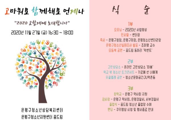 이번 행사는 총 3부로 진행되며 2020년 사업보고 및 은평구 청소년 실태조사 발표로 구성된 1부를 시작으로, 2부에서는 은평구 청소년들의 고민을 들어주는 온라인 고민상담소 ‘따봉’과 학교 밖 청소년들의 진솔한 이야기를 담은 학교 밖 청소년 토크콘서트 ‘기로에 선 너에게’가 진행되며,