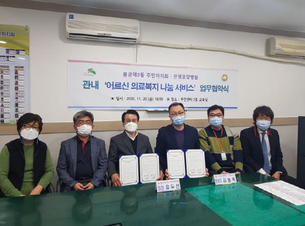 은평구 불광제2동 주민자치회와 은평요양병원은 지난 20일 관내 ‘어르신 의료복지 나눔 서비스’ 업무협약식을 가졌다. 양 기관은 어르신들의 행복한 삶의 질 향상을 위해 상호 협력하기로 약속했다.