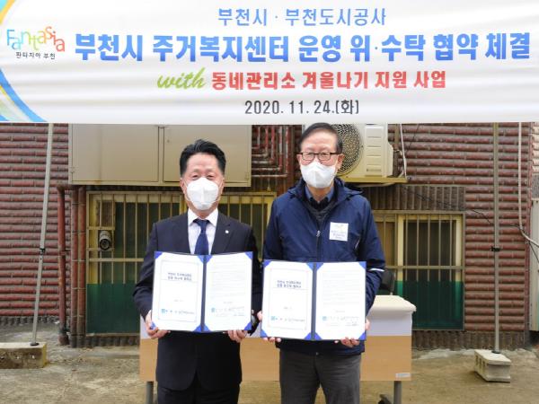 협약식 후에 장덕천 부천시장과 김동호 사장은 고강동 은행단지에 거주하는 어르신 가정이 한겨울에도 따뜻한 생활을 할 수 있도록 돕는 ‘겨울나기 지원사업’에 참여해 뜻깊은 시간을 가졌다. 이는 공사에서 노후한 저층 주거지 대상으로 운영해 온 ‘동네관리소’ 소규모 무상 집수리 사업의 일환으로, 주택의 단열과 보온성을 높이는 단열작업과 낡은 전등·수전 교체 등을 수행했다. 이날 모든 참석자들은 방역 수칙을 철저히 준수하면서 행사에 임했다.