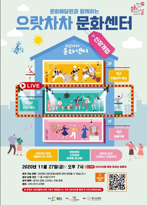 한편, ‘신장개업, 으랏차차 문화센터’은 2020년 문화체육관광부 공모지원 사업인 ‘문화가 있는 날’ 기획 프로그램으로 코로나19에서도 안전하게 시민들이 참여할 수 있게 드라이브 마켓, 온택트 콘서트 형태로 사업을 운영하고 있다.