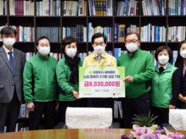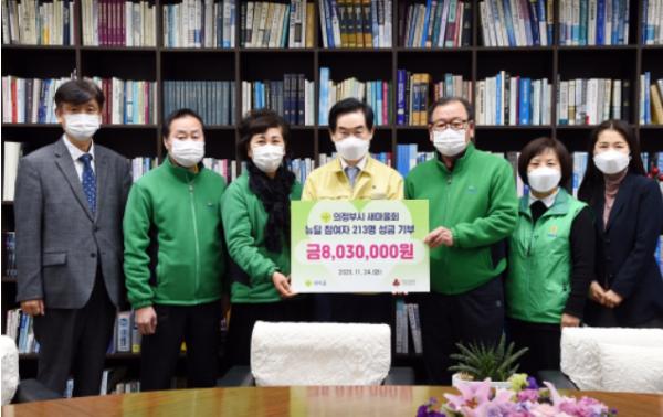 의정부시는 11월 24일 의정부시새마을회 자생단체 특화 뉴딜사업 참여자들이 십시일반 모은 성금 803만 원을 사회복지공동모금회에 기탁했다고 밝혔다.