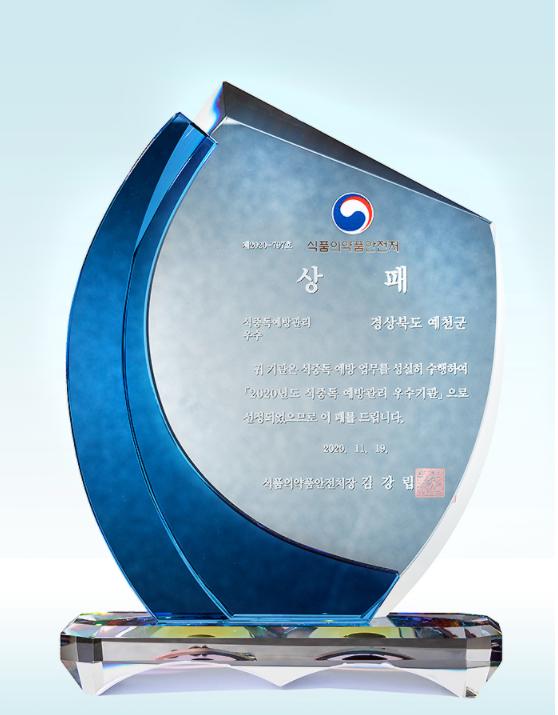 예천군이 식품의약품안전처에서 주관하는 ‘2020년 전국 식중독예방 관리 사업 평가’에서 우수 기관으로 선정돼 식품의약품안전처장 기관표창을 수상했다.