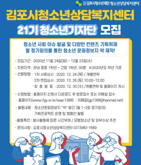 김포시 청소년재단 청소년상담복지센터는 청소년들이 사회 이슈를 발굴해 사회에 대한 올바른 시선을 키우고 청소년 주도의 활동 문화 안착을 도모하기 위해 2021년도 제21기 청소년기자단원을 모집한다고 밝혔다.