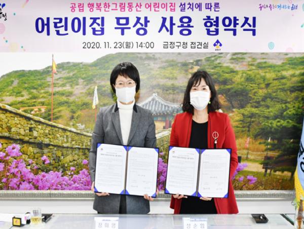 부산광역시 금정구는 지난 23일 장기임차 방식의 공립어린이집 설치를 위해 행복한그림동산 어린이집(대표 성순임)과 어린이집 건물 무상임대 및 사무 위ㆍ수탁 협약을 체결했다.